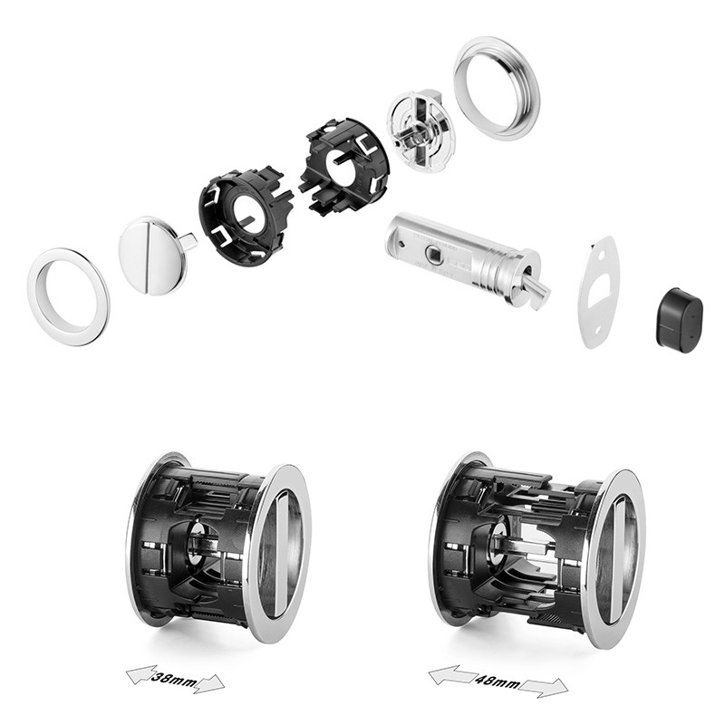 - Slechts een aantal gaten zijn nodig voor dit systeem; slot, kom, aanslag en trekkom
