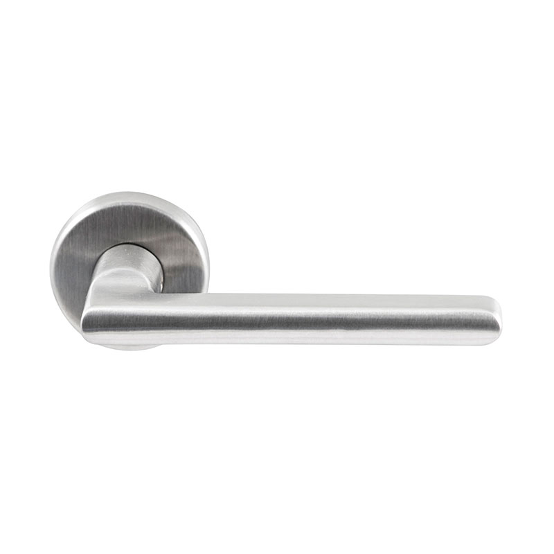 Een twintigtal moderne deurkrukken in RVS met geveerde rozetten, een prettige prijs en hoogwaardige kwaliteit.