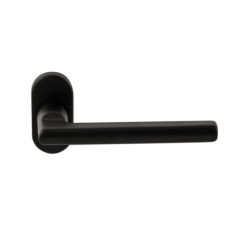 Een twintigtal moderne deurkrukken in RVS met zwarte poedercoating met geveerde rozetten, een prettige prijs en hoogwaardige kwaliteit.