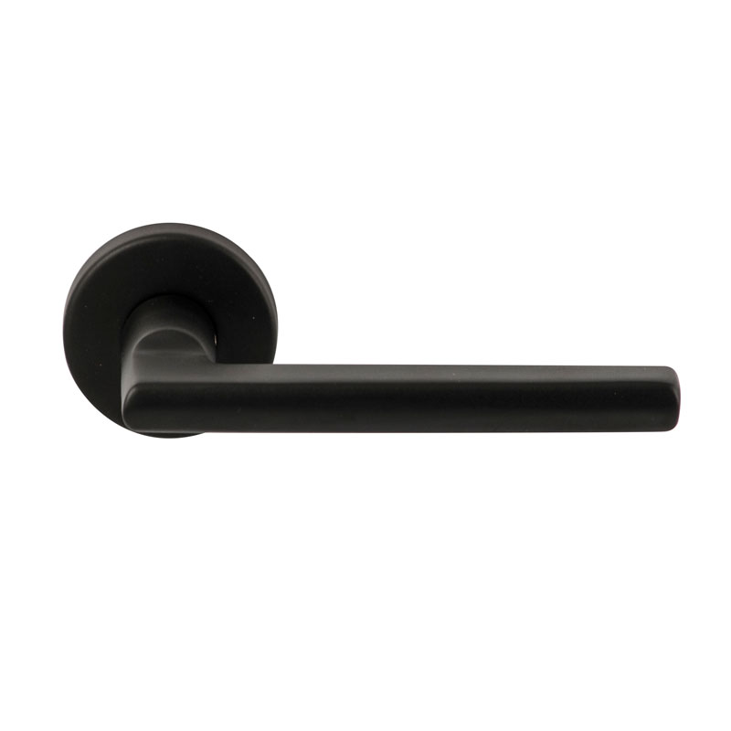 Een twintigtal moderne deurkrukken in RVS met zwarte poedercoating met geveerde rozetten, een prettige prijs en hoogwaardige kwaliteit.