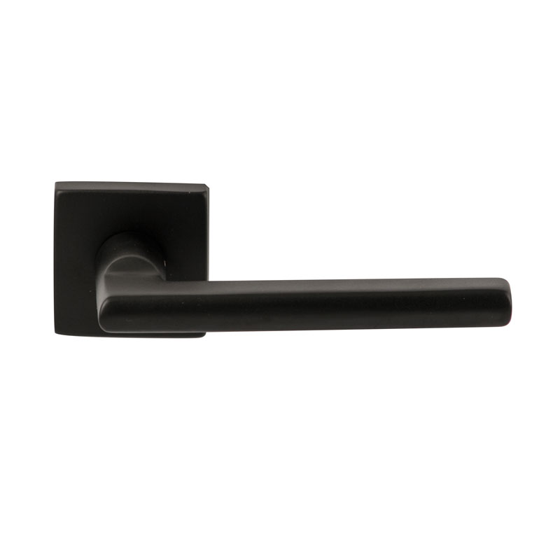 Een twintigtal moderne deurkrukken in RVS met zwarte poedercoating met geveerde rozetten, een prettige prijs en hoogwaardige kwaliteit.