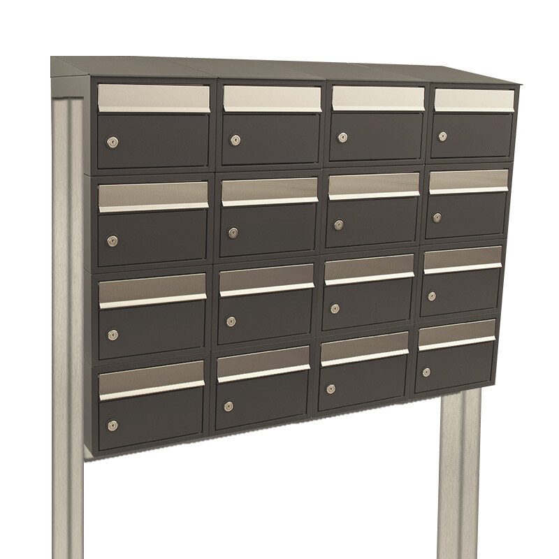 De Stoer! Brick 4-breed, 4-hoog met dak op statief antraciet is een modulair brievenbussysteem met een korte levertijd.