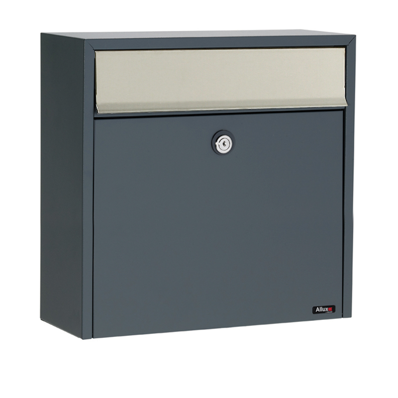 Brievenbus Allux 2500 antraciet/inox klep is een afsluitbare brievenbus, vervaardigd uit verzinkt staal en RVS accenten, waarna behandeld met een sterke antraciete poedercoating (AISI304/RAL7024).