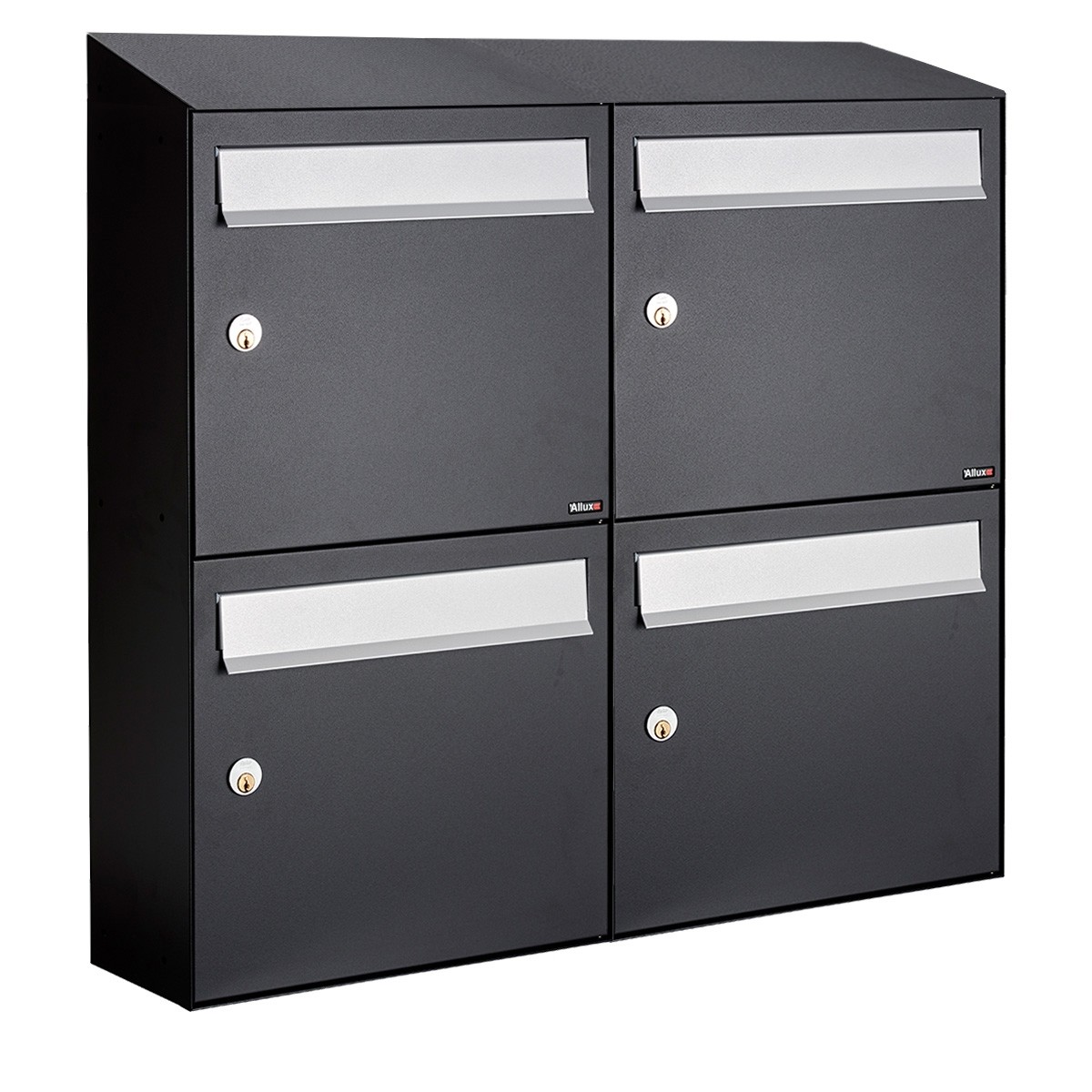 De Allux brievenbus Flow 2-breed, 2-hoog met dak zwart is een modulair brievenbussysteem met afmeting 400x350x170mm (bxhxd) per brievenbus, met een korte levertijd.
