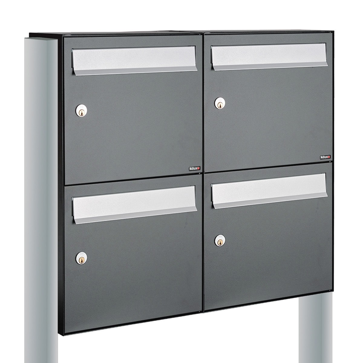 De Allux brievenbus Flow 2-breed, 2-hoog op statief antraciet is een modulair brievenbussysteem met afmeting 400x350x170mm (bxhxd) per brievenbus, met een korte levertijd.