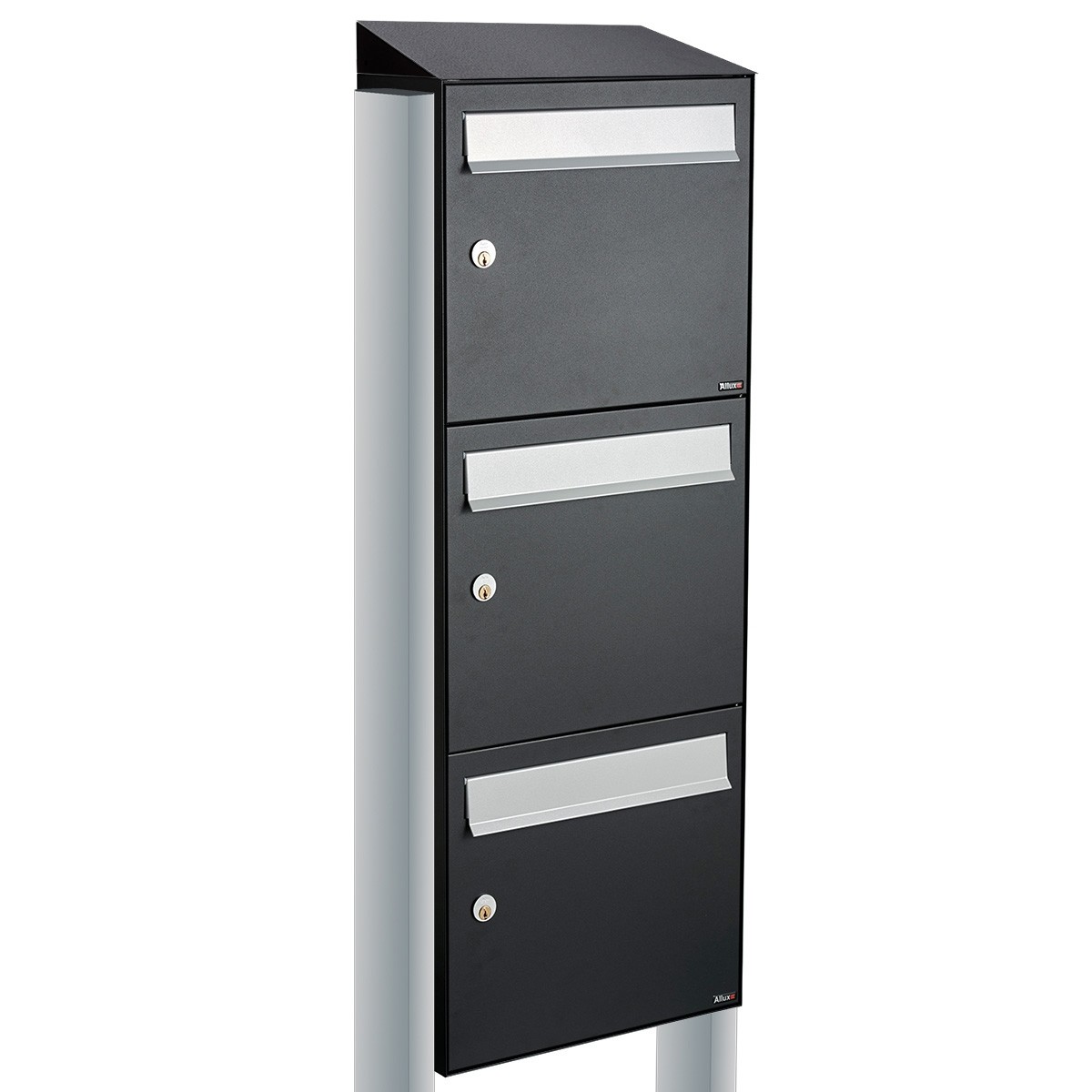 De Allux brievenbus Flow 3-hoog met dak op statief zwart is een modulair brievenbussysteem met afmeting 400x350x170mm (bxhxd) per brievenbus, met een korte levertijd.