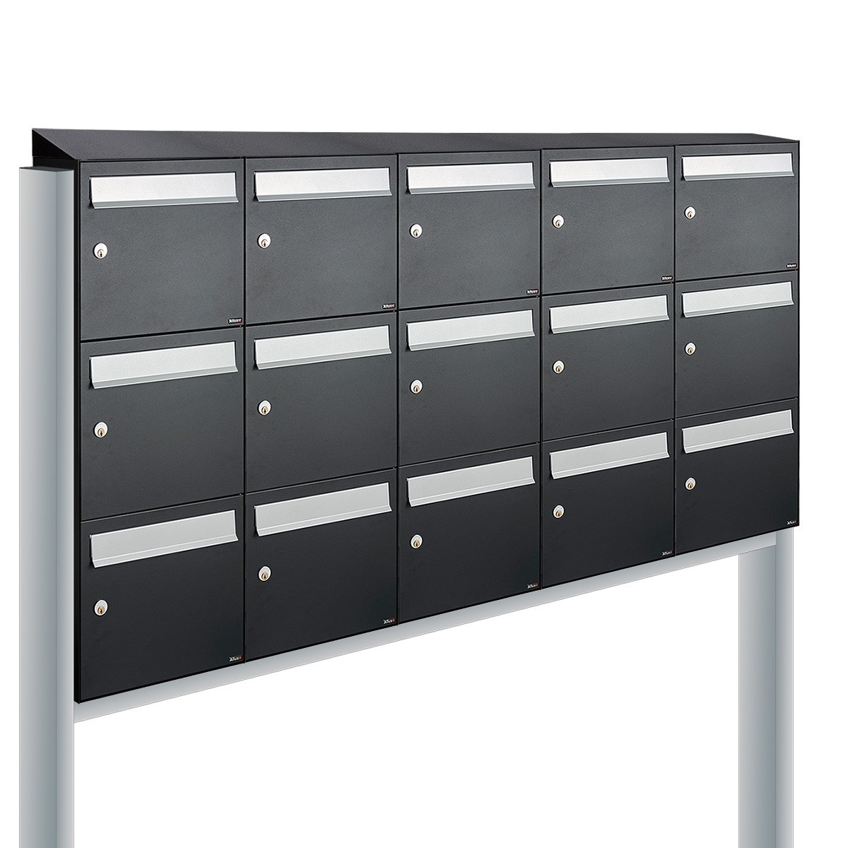 De Allux brievenbus Flow 5-breed, 3-hoog met dak op statief zwart is een modulair brievenbussysteem met afmeting 400x350x170mm (bxhxd) per brievenbus, met een korte levertijd.