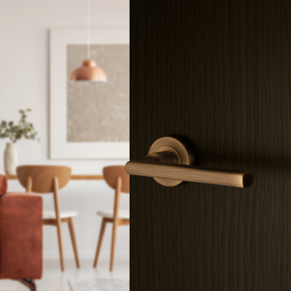 Deurkruk Sara rond rozet Artax matbrons heeft een mooie vormgeving. Wilt u het uiterlijk van de deurklink graag doorvoeren in uw interieur, dan hebben we bijpassende grepen en deurkrukken die erg goed te combineren zijn met bijvoorbeeld stalen/ houten deuren (staal-look).