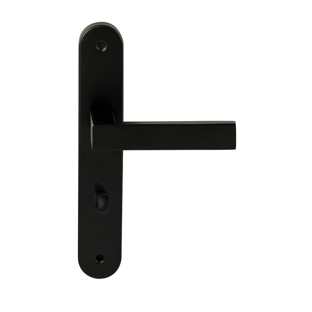 Deze massieve deurklink zwart op een ovaal WC.63/8 langschild is een strak model met een extra brede vlakke voorkant van 25mm hoog. De oversized hals is 25x25mm. Het langschild is vast draaibaar uitgevoerd en enkel geveerd.