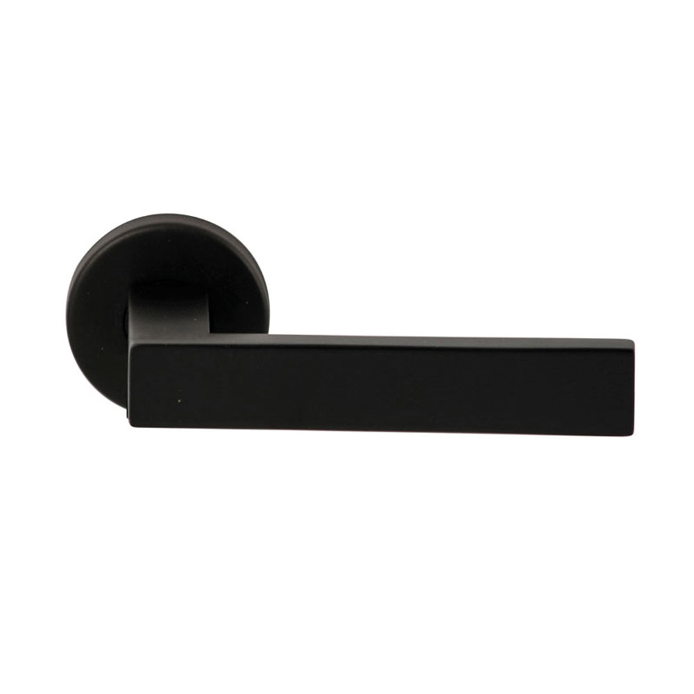 De deurklink Seattle zwart op rond rozet is een strak model met een extra brede vlakke voorkant van 25mm hoog. De oversized hals is 25x25mm.