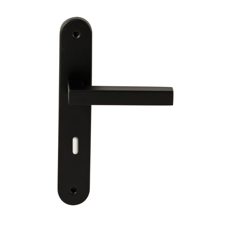 Een twintigtal moderne deurkrukken in RVS met zwarte poedercoating die vastgeveerd op een schild geleverd worden met een prettige prijs en hoogwaardige kwaliteit. Voorzien van een sleutelgat uitsparing op 72mm van het krukgat.