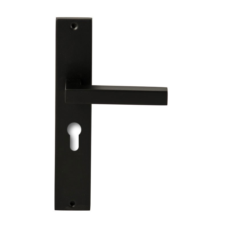 Een twintigtal moderne deurkrukken in RVS met zwarte poedercoating die vastgeveerd op een schild geleverd worden met een prettige prijs en hoogwaardige kwaliteit. Voorzien van een europrofiel uitsparing op 55mm van het krukgat.