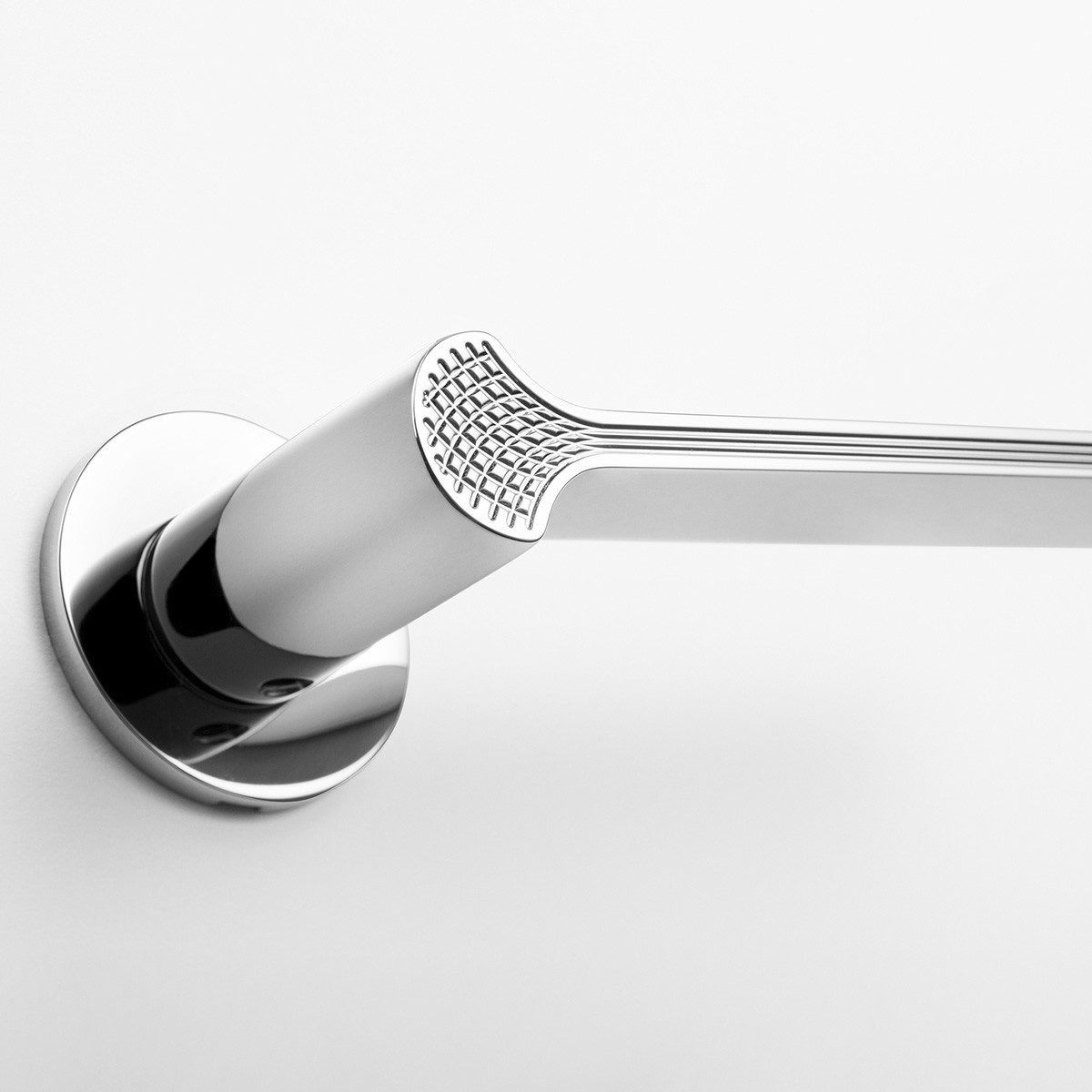 De vorm van de deurkruk Ginkgo Biloba op rond FINE rozet chroom is gebaseerd op de natuur. En specifiek op de vorm van het blad van de Japanse notenboom; Ginkgo Biloba. Ontworpen door Giulio Iacchetti.