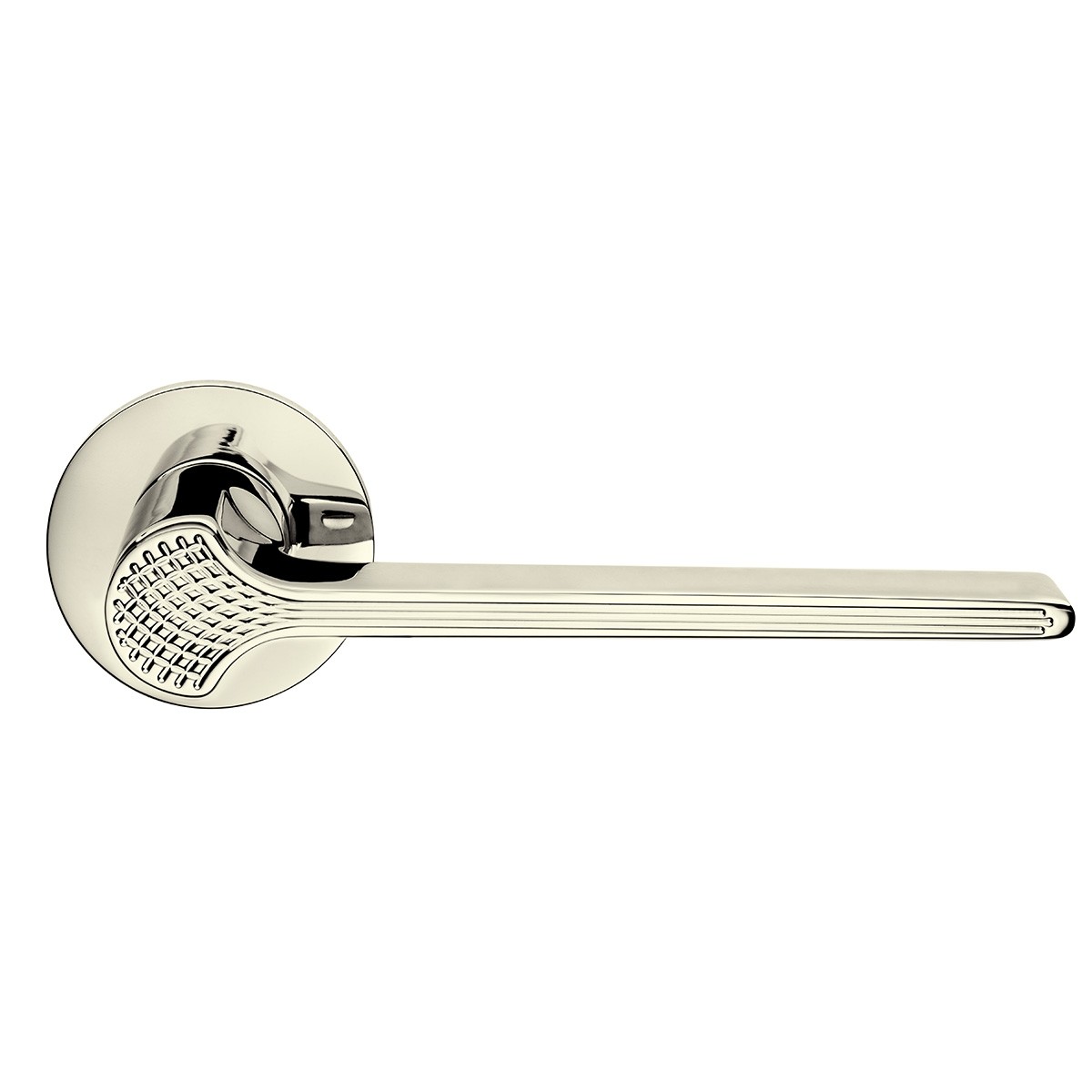 De vorm van de deurkruk Ginkgo Biloba op rond FINE rozet glans nikkel is gebaseerd op de natuur. En specifiek op de vorm van het blad van de Japanse notenboom; Ginkgo Biloba. Ontworpen door Giulio Iacchetti.