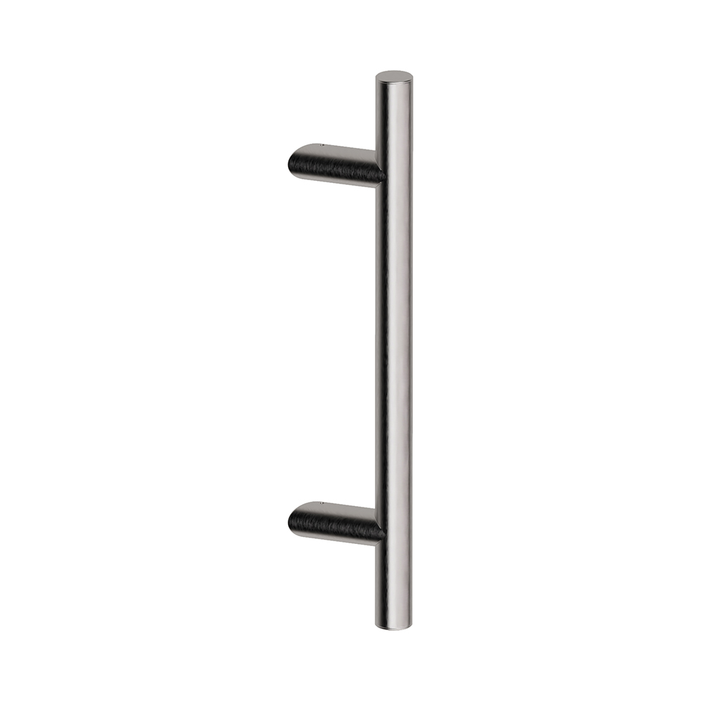 De ronde handgreep Frankfurt S 25x300x460mm inox op schuine voet is een mooie handgreep voor enkelzijdig of dubbelzijdig gebruik op bijvoorbeeld schuif- en klapdeuren.