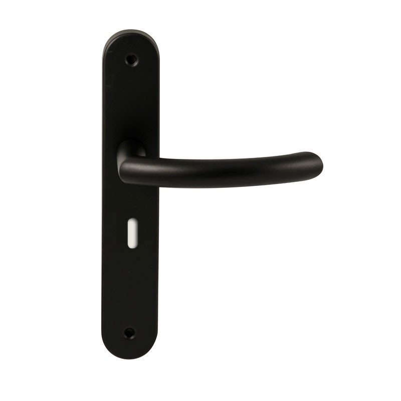 Een twintigtal moderne deurkrukken in RVS met zwarte poedercoating die vastgeveerd op een schild geleverd worden met een prettige prijs en hoogwaardige kwaliteit.