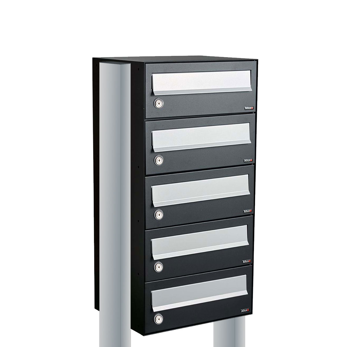 Deze set bestaat uit 5 brievenbussen en een set statieven. Het blok wordt compleet geleverd. De statieven worden los meegeleverd en zijn geschikt om in beton te gieten. Het enige constructiewerk op locatie is het boren van 2 gaten en het monteren van de onderdelen.