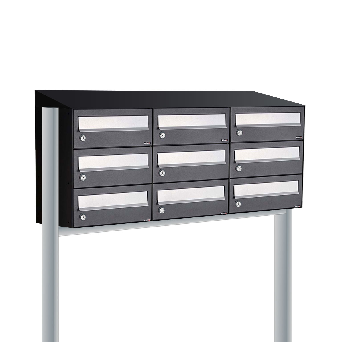 Deze set bestaat uit 9 brievenbussen, 1 dak en een set statieven. Het blok wordt compleet geleverd. De statieven worden los meegeleverd en zijn geschikt om in beton te gieten. Het enige constructiewerk op locatie is het boren van 2 gaten en het monteren van de onderdelen.