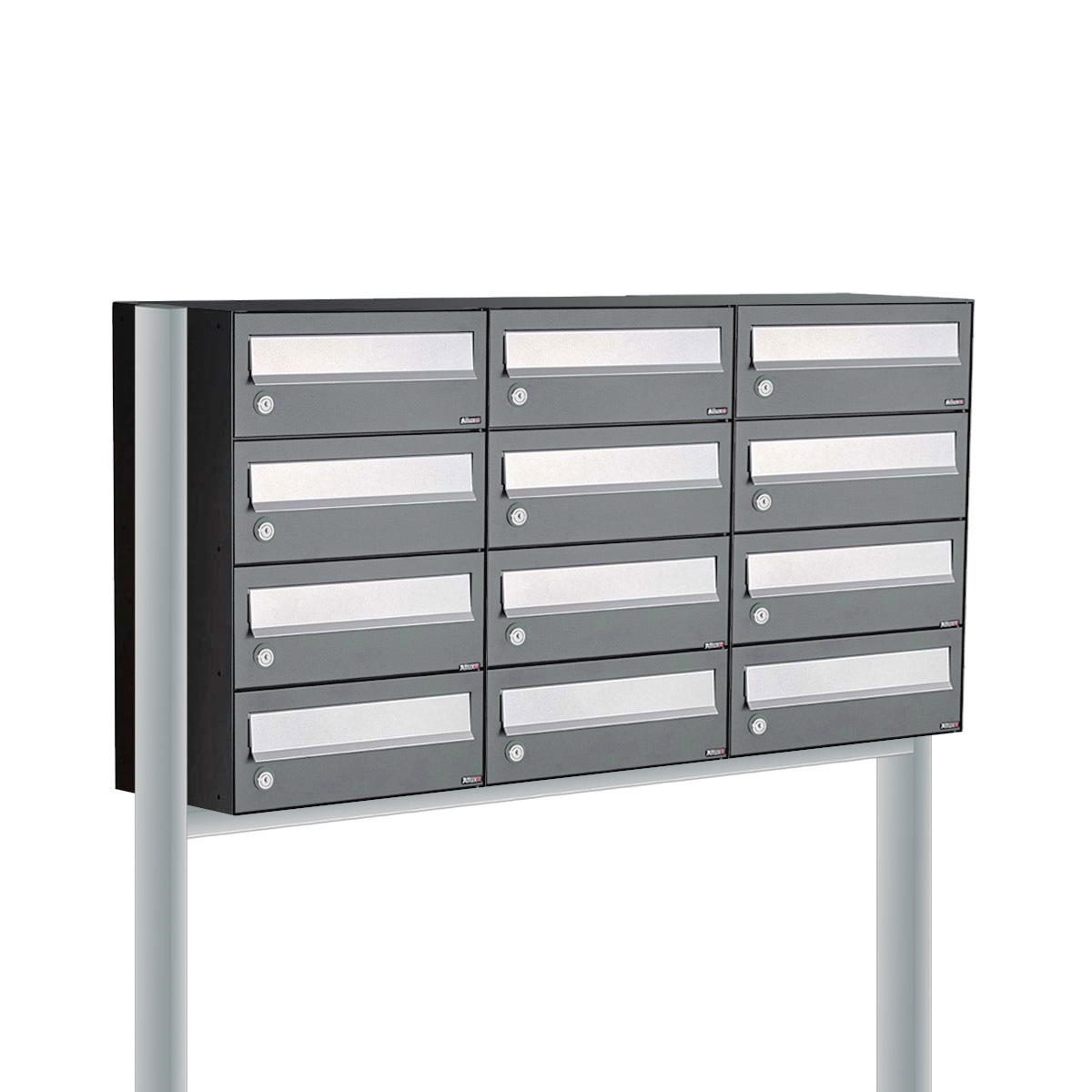 Deze set bestaat uit 12 brievenbussen en een set statieven. Het blok wordt compleet geleverd. De statieven worden los meegeleverd en zijn geschikt om in beton te gieten. Het enige constructiewerk op locatie is het boren van 2 gaten en het monteren van de onderdelen.