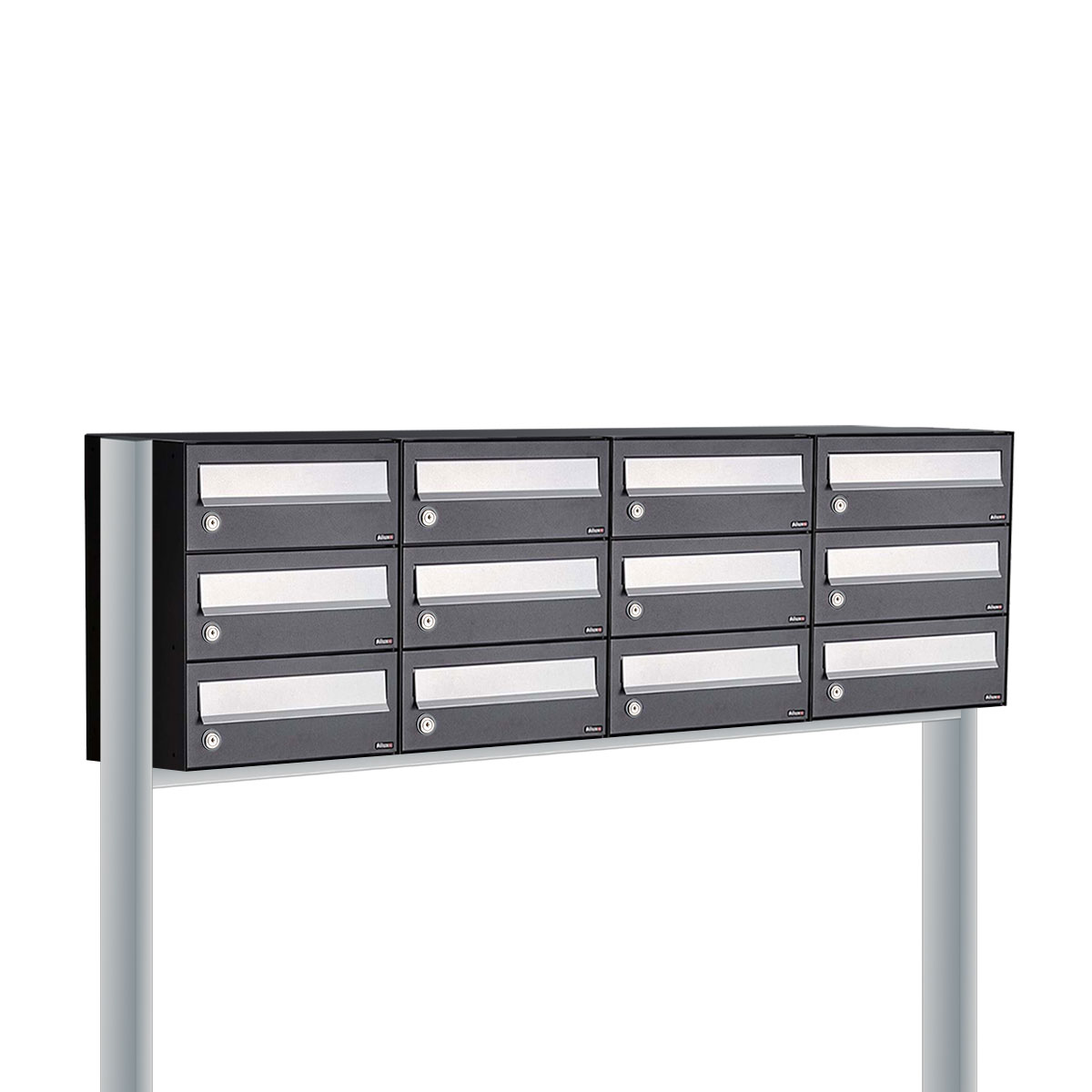 Deze set bestaat uit 12 brievenbussen en een set statieven. Het blok wordt compleet geleverd. De statieven worden los meegeleverd en zijn geschikt om in beton te gieten. Het enige constructiewerk op locatie is het boren van 2 gaten en het monteren van de onderdelen.