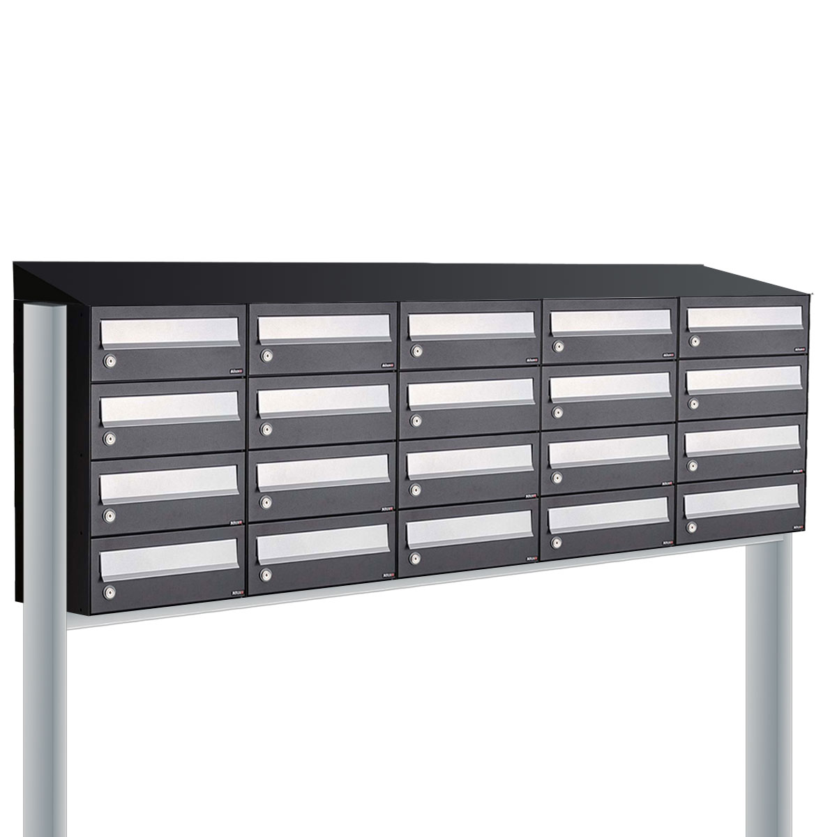 Deze set bestaat uit 20 brievenbussen, 1 dak en een set statieven. Het blok wordt compleet geleverd. De statieven worden los meegeleverd en zijn geschikt om in beton te gieten. Het enige constructiewerk op locatie is het boren van 2 gaten en het monteren van de onderdelen.