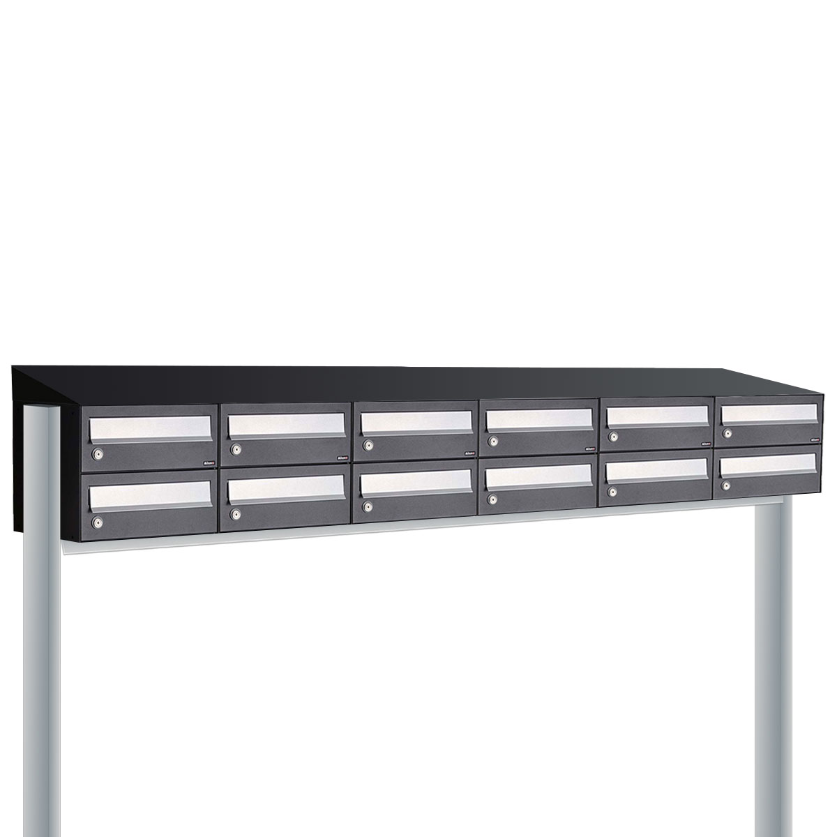 Deze set bestaat uit 12 brievenbussen, 1 dak en een set statieven. Het blok wordt compleet geleverd. De statieven worden los meegeleverd en zijn geschikt om in beton te gieten. Het enige constructiewerk op locatie is het boren van 2 gaten en het monteren van de onderdelen.