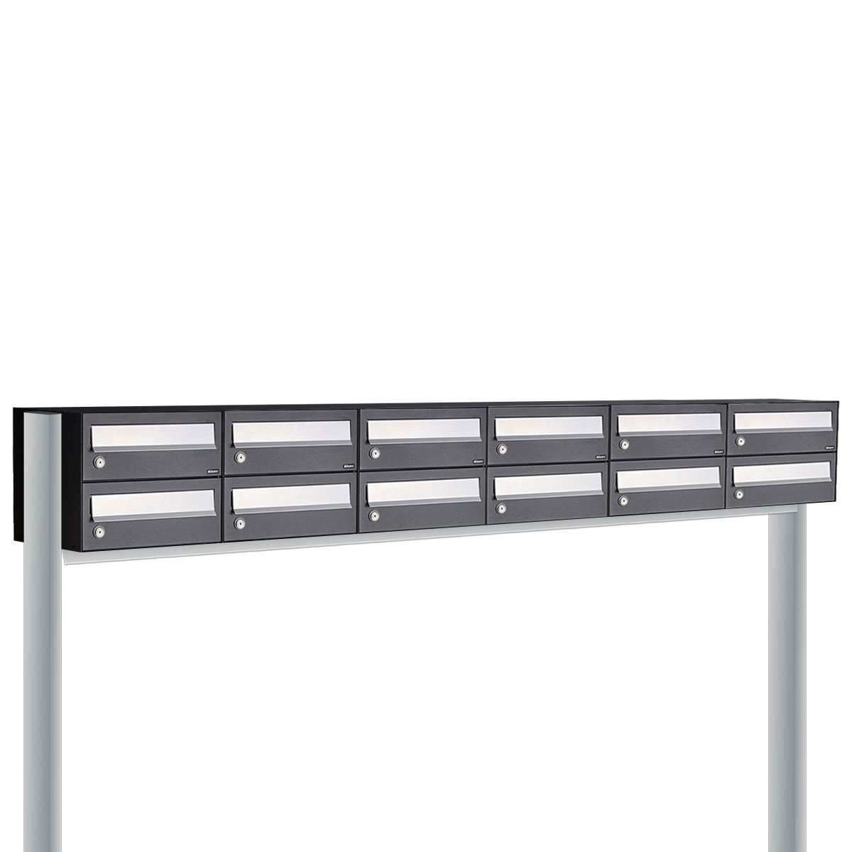 Deze set bestaat uit 12 brievenbussen en een set statieven. Het blok wordt compleet geleverd. De statieven worden los meegeleverd en zijn geschikt om in beton te gieten. Het enige constructiewerk op locatie is het boren van 2 gaten en het monteren van de onderdelen.