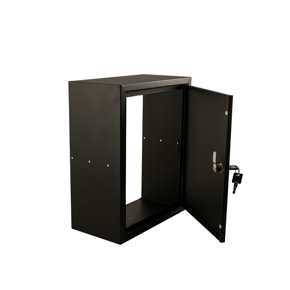 De inbouwkast zwart 165mm bestaat uit een kader en een deur. De deur is gemakkelijk aan te passen in draairichting. Het kader is voorzien van een waterkering. De verzinkt stalen basis is afwerkt met een zwart poedercoating (RAL 9011). De kast met open achterzijde wordt geleverd met een Euro-Locks automatenslot met 2 sleutels.