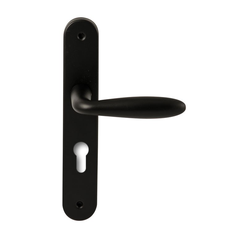 Een twintigtal moderne deurkrukken in RVS met zwarte poedercoating die vastgeveerd op een schild geleverd worden met een prettige prijs en hoogwaardige kwaliteit.