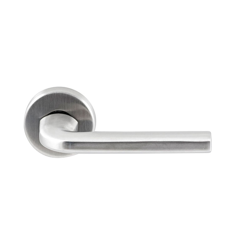 Een twintigtal moderne deurkrukken in RVS met geveerde rozetten, een prettige prijs en hoogwaardige kwaliteit.