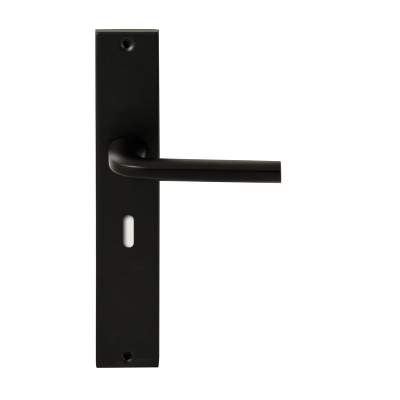 Een twintigtal moderne deurkrukken in RVS met zwarte poedercoating die vastgeveerd op een schild geleverd worden met een prettige prijs en hoogwaardige kwaliteit.
