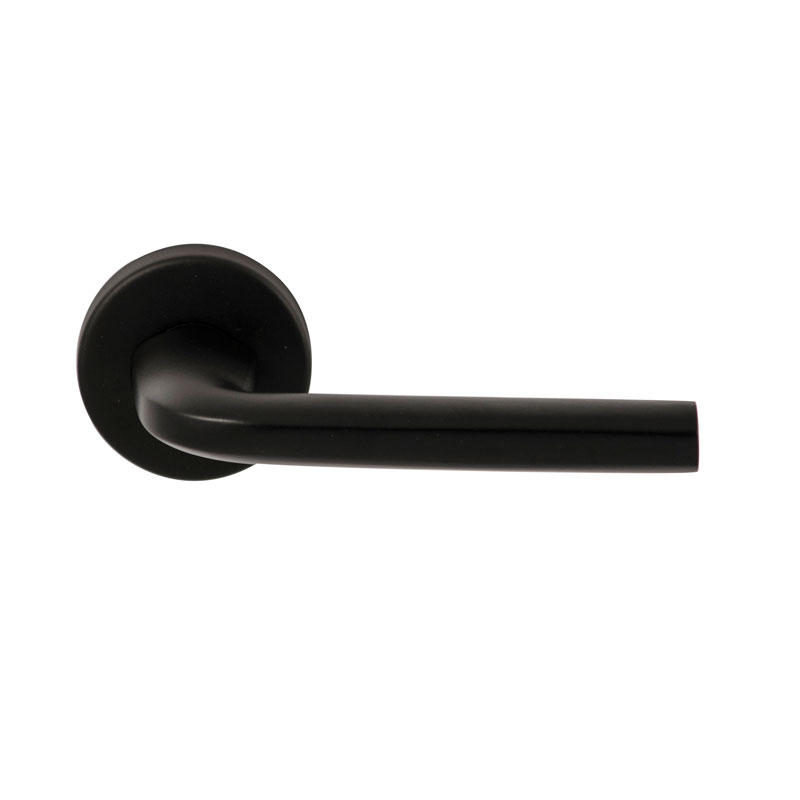 Een twintigtal moderne deurkrukken in RVS met zwarte poedercoating met geveerde rozetten, een prettige prijs en hoogwaardige kwaliteit.