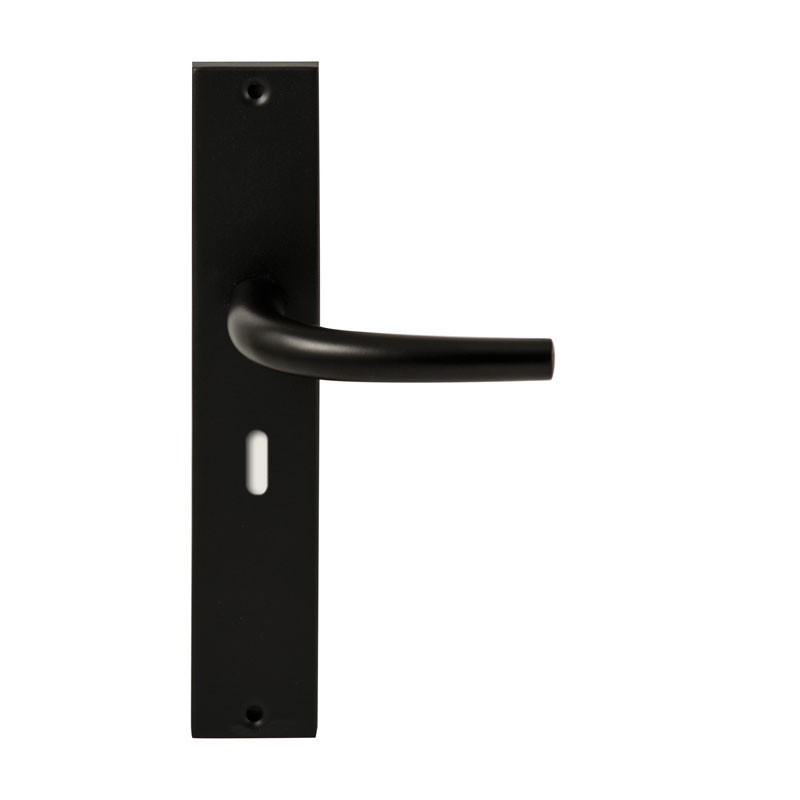 Een twintigtal moderne deurkrukken in RVS met zwarte poedercoating die vastgeveerd op een schild geleverd worden met een prettige prijs en hoogwaardige kwaliteit.