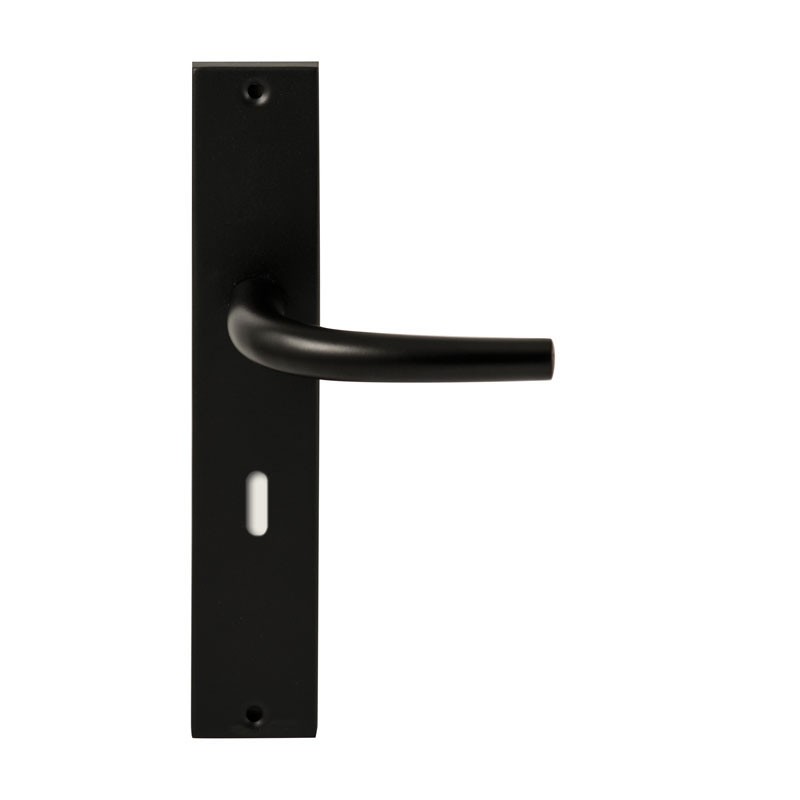 Een twintigtal moderne deurkrukken in RVS met zwarte poedercoating die vastgeveerd op een schild geleverd worden met een prettige prijs en hoogwaardige kwaliteit.