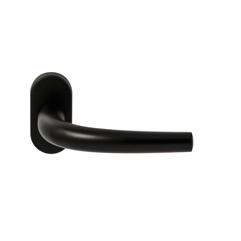 Een twintigtal moderne deurkrukken in RVS met zwarte poedercoating met geveerde rozetten, een prettige prijs en hoogwaardige kwaliteit.