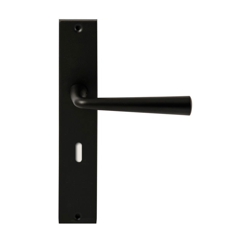 Een twintigtal moderne deurkrukken in RVS met zwarte poedercoating die vastgeveerd op een schild geleverd worden met een prettige prijs en hoogwaardige kwaliteit.
