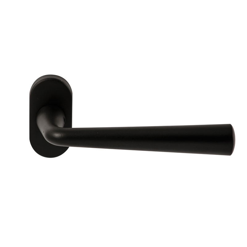Een twintigtal moderne deurkrukken in RVS met zwarte poedercoating met geveerde rozetten, een prettige prijs en hoogwaardige kwaliteit.