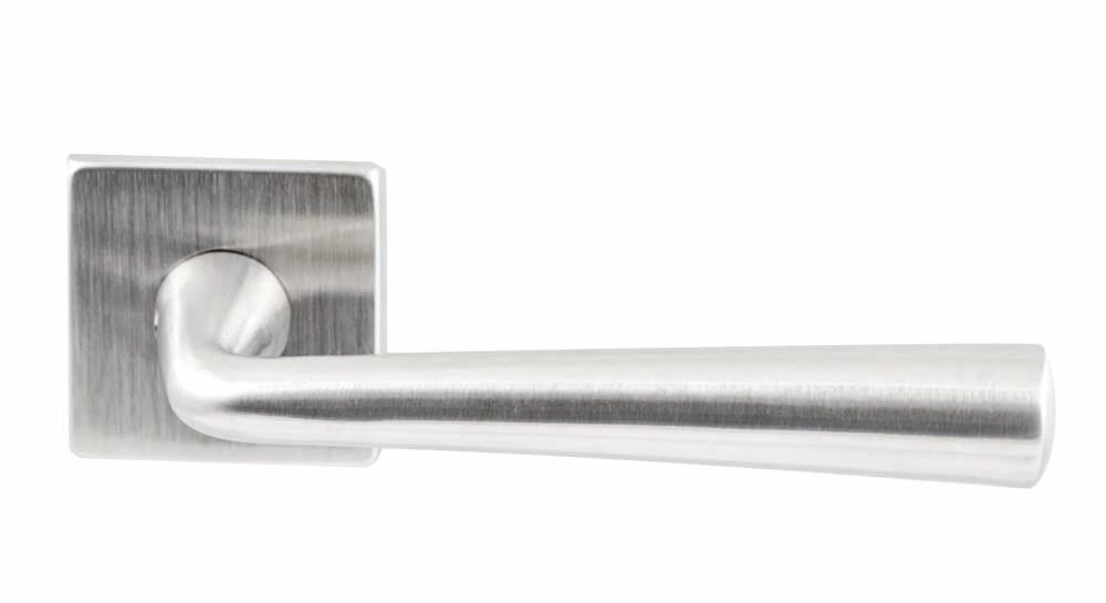 Deze massief RVS deurkruk heeft een trapeziummodel en kan gerust ons XL model genoemd worden. De deurkruk zelf is namelijk 142mm lang. Deze deurkruk wordt geleverd op dun vierkant rozet.