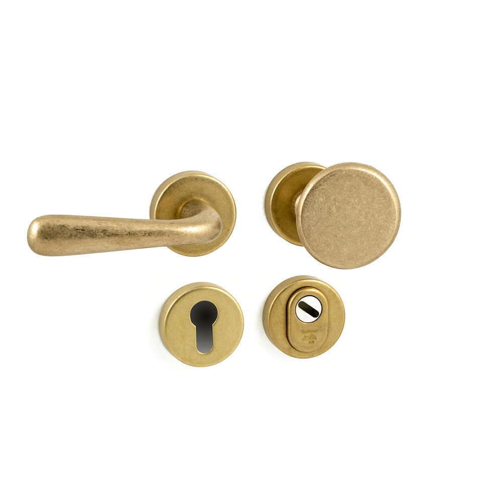 De voordeurgarnituur komt uit ons Mariani assortiment. Het voordeurgarnituur is uitgevoerd in getrommeld messing en daarmee onze puurste afwerking. Deze set wordt na productie getrommeld om een stoer uiterlijk te verkrijgen. Omdat wij verder niets met dit product doen is het een veilig product. Een krasje meer of minder is dan ook geen enkel probleem. Na verloop van tijd zal dit product (omdat het ongelakt is) wat donkerder worden.