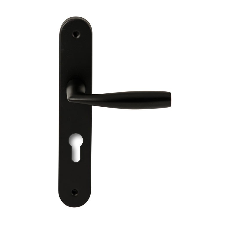 Een twintigtal moderne deurkrukken in RVS met zwarte poedercoating die vastgeveerd op een schild geleverd worden met een prettige prijs en hoogwaardige kwaliteit.