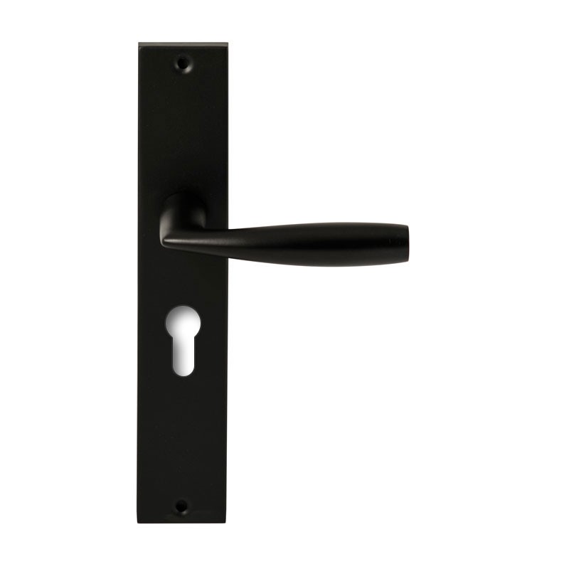 Een twintigtal moderne deurkrukken in RVS met zwarte poedercoating die vastgeveerd op een schild geleverd worden met een prettige prijs en hoogwaardige kwaliteit.