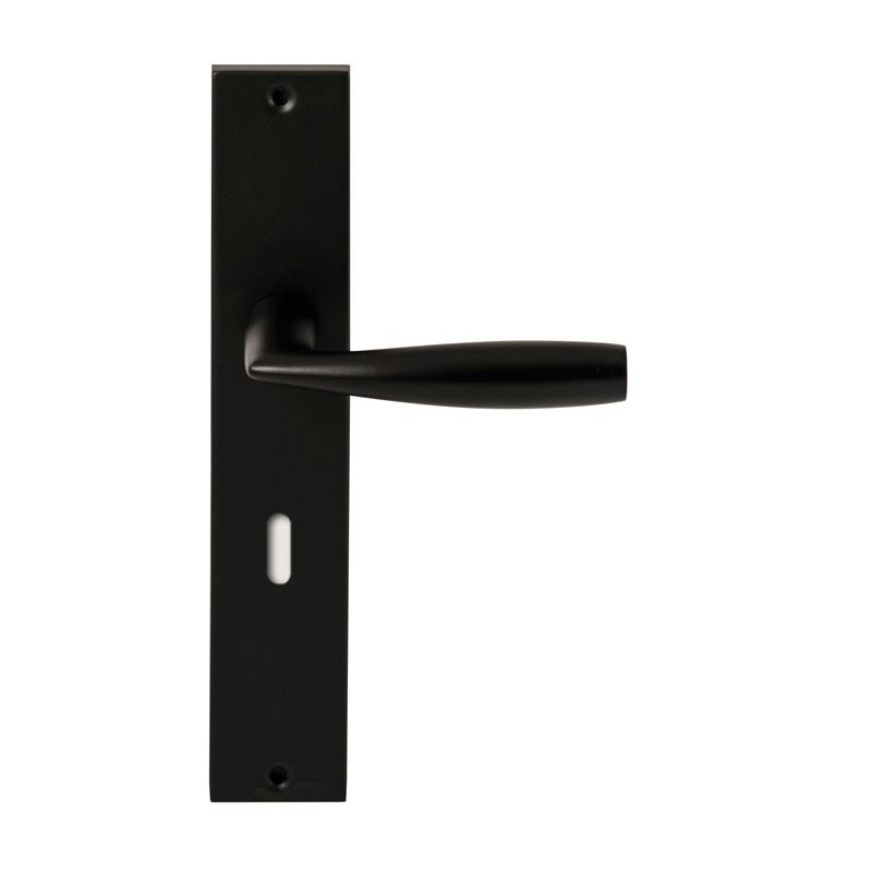 Een twintigtal moderne deurkrukken in RVS met zwarte poedercoating die vastgeveerd op een schild geleverd worden met een prettige prijs en hoogwaardige kwaliteit.