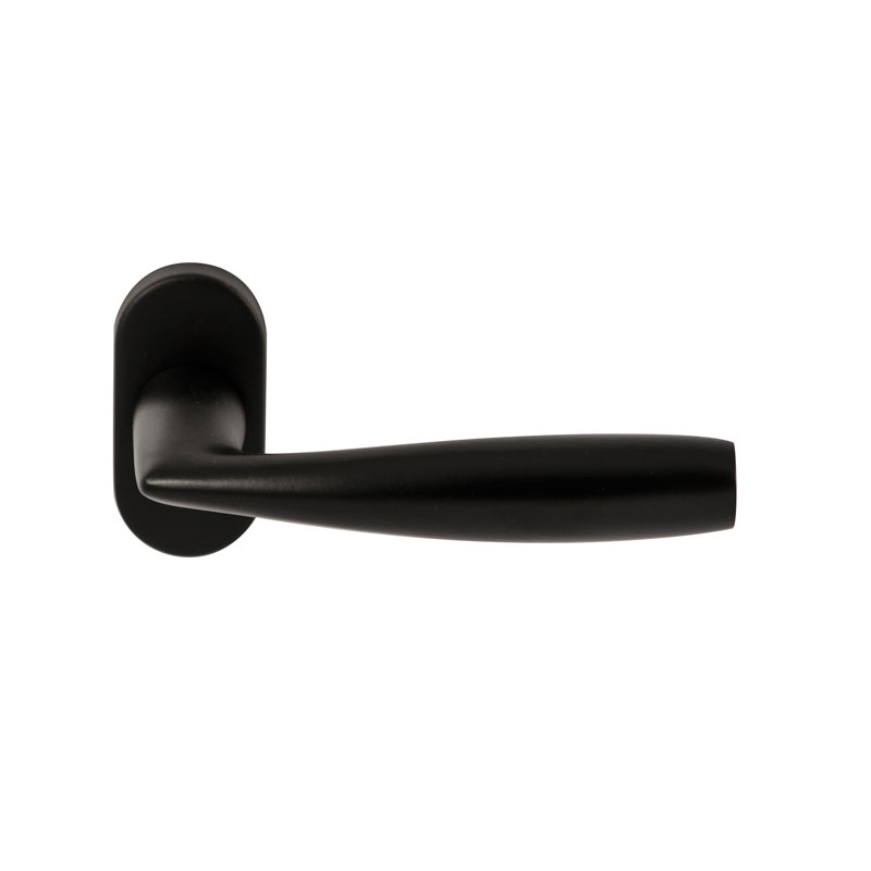 Een twintigtal moderne deurkrukken in RVS met zwarte poedercoating met geveerde rozetten, een prettige prijs en hoogwaardige kwaliteit.