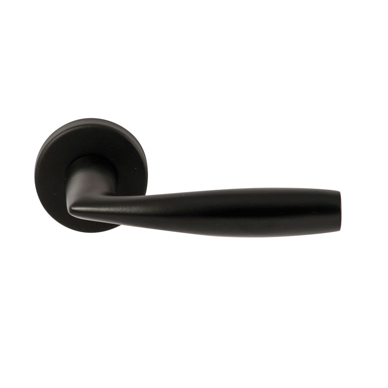 Een twintigtal moderne deurkrukken in RVS met zwarte poedercoating met geveerde rozetten, een prettige prijs en hoogwaardige kwaliteit.