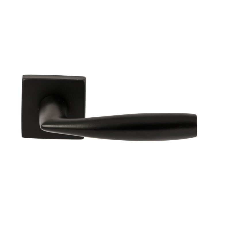 Een twintigtal moderne deurkrukken in RVS met zwarte poedercoating met geveerde rozetten, een prettige prijs en hoogwaardige kwaliteit.