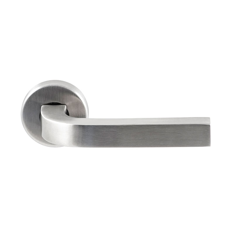 Een twintigtal moderne deurkrukken in RVS met geveerde rozetten, een prettige prijs en hoogwaardige kwaliteit.