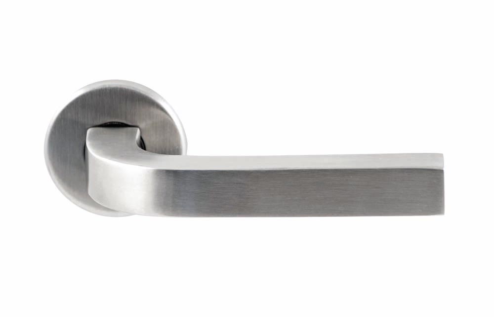 Een combinatie van vierkant en rond geeft deze strakke deurkruk een vriendelijk uiterlijk. Deze deurkruk wordt geleverd op dun rond rozet.