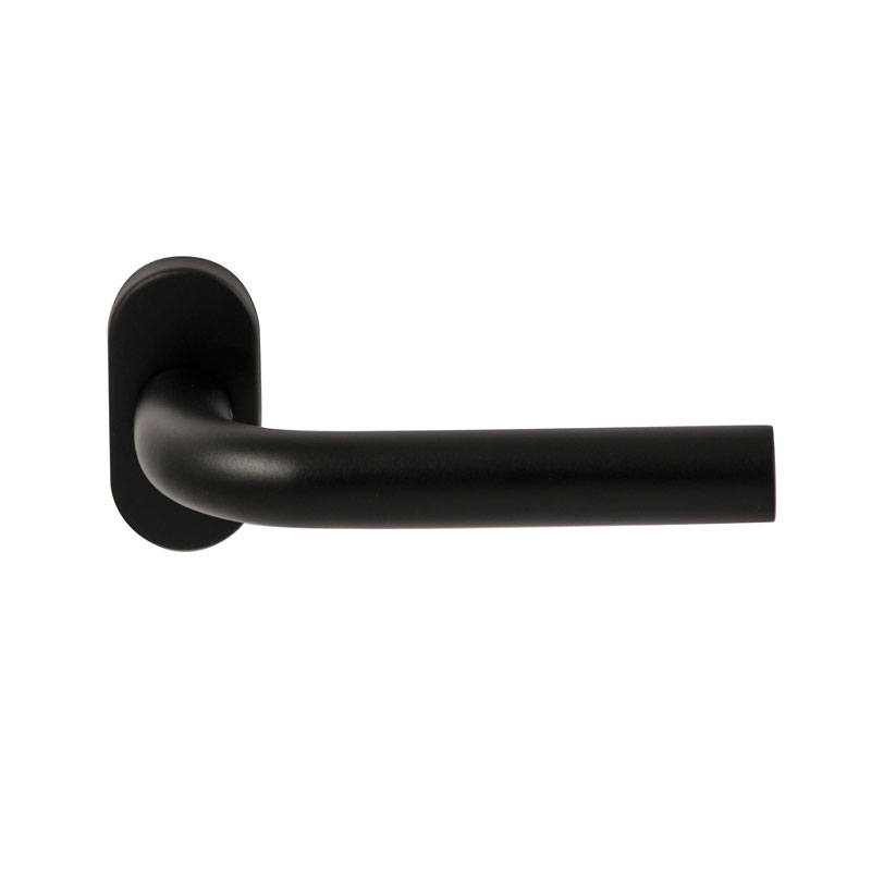 Een twintigtal moderne deurkrukken in RVS met zwarte poedercoating met geveerde rozetten, een prettige prijs en hoogwaardige kwaliteit.