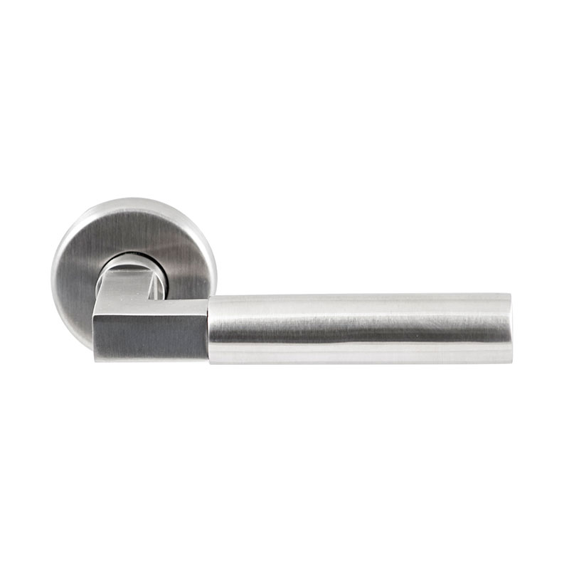 Een twintigtal moderne deurkrukken in RVS met geveerde rozetten, een prettige prijs en hoogwaardige kwaliteit.
