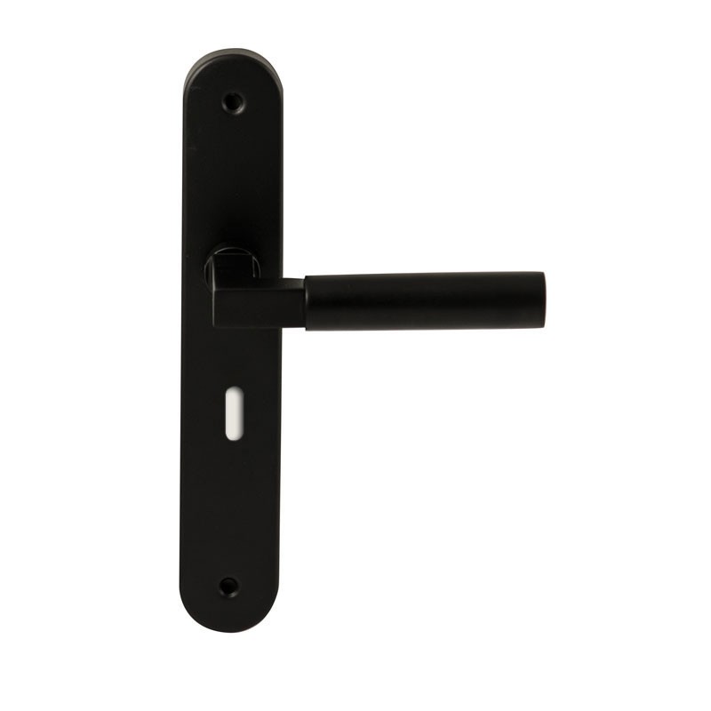 Een twintigtal moderne deurkrukken in RVS met zwarte poedercoating die vastgeveerd op een schild geleverd worden met een prettige prijs en hoogwaardige kwaliteit.
